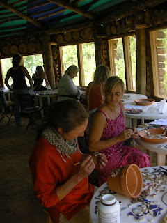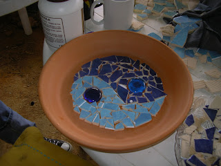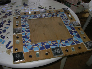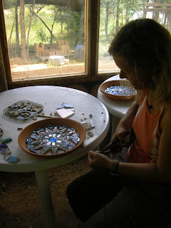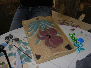 Bring what you have from home, i.e. Different colored tiles, glass and mirror, broken crockery, beads, pebbles, shells, gloves, protection glasses, tile cutter, PVA glue, plaster board/wooden ply board, or ceramic pot/plate/frame to cover etc.